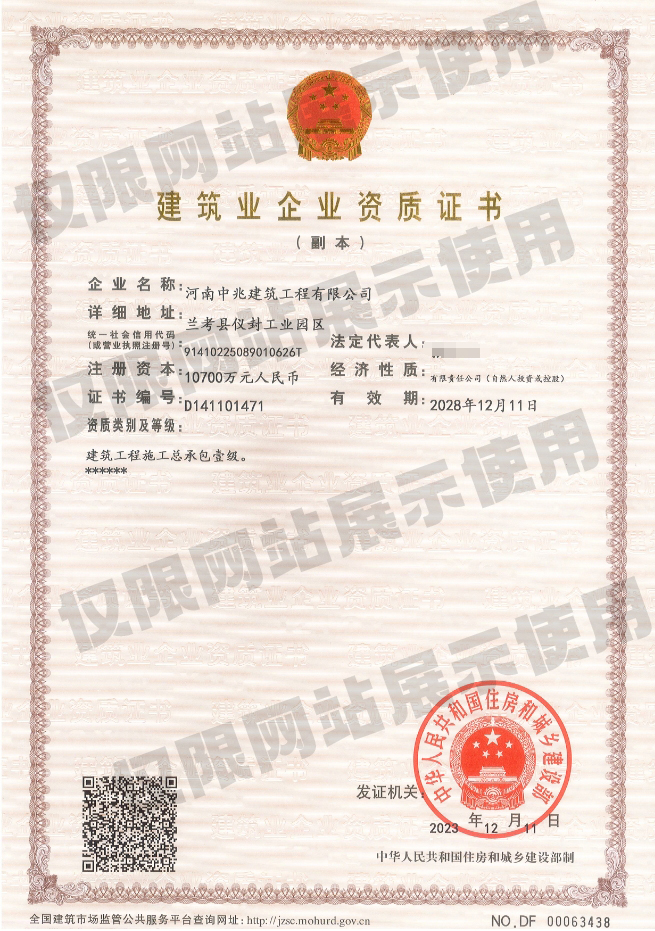 • 河南中兆建筑工程有限公司成立于2013年,公司注冊資本10700萬元,凈資產(chǎn)總額近1.9億元。公司目前具有“建筑工程、市政公用工程、鋼結(jié)構(gòu)工程、建筑機電安裝工程、建筑裝修裝飾工程、地基與基礎(chǔ)工程、消防設(shè)施工程、壓力管道”等17個資質(zhì)。現(xiàn)有從業(yè)人員2150人,具有中高級各類專業(yè)技術(shù)職稱管理人員達120人,壹級、貳級建造師約90余人;主要施工設(shè)備300多臺(套)。通過了ISO9001質(zhì)量管理體系認證、職業(yè)健康安全管理體系認證、環(huán)境管理體系認證,并多次獲得省級“AAA”信用企業(yè)、“重合同守信用”、“先進建筑企業(yè)...